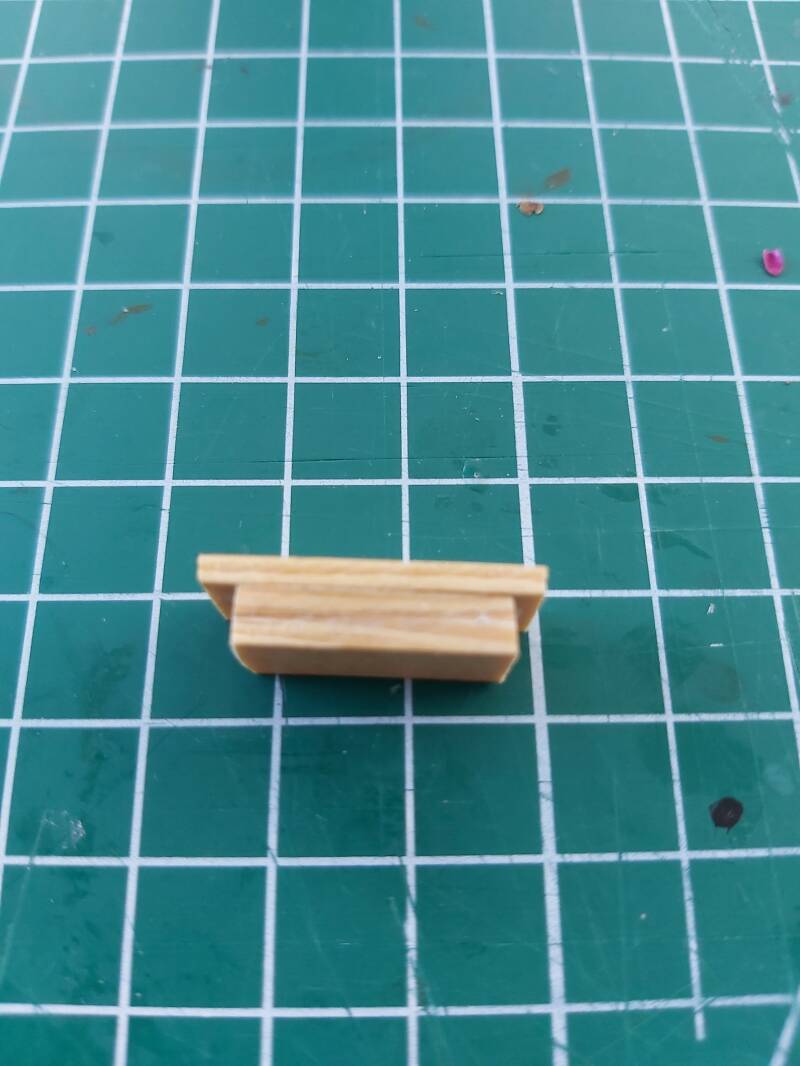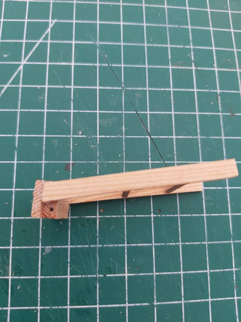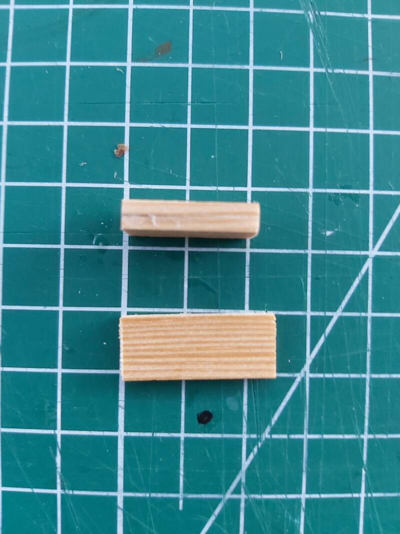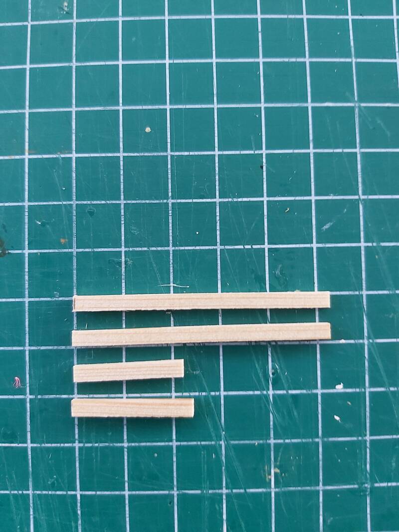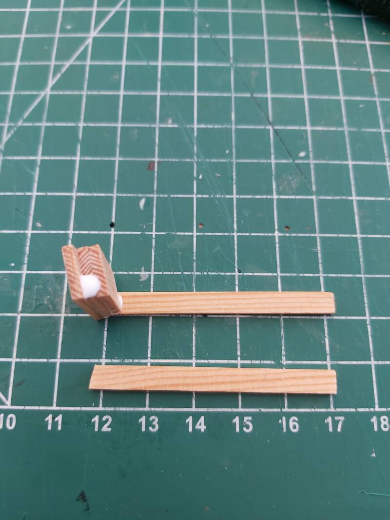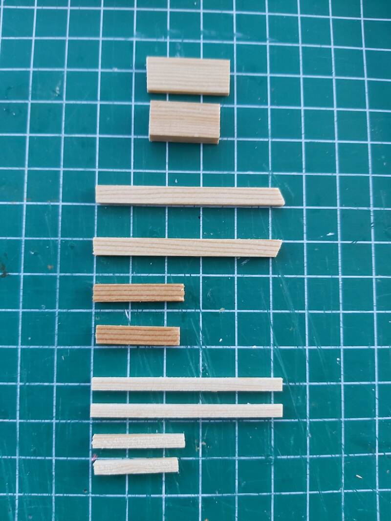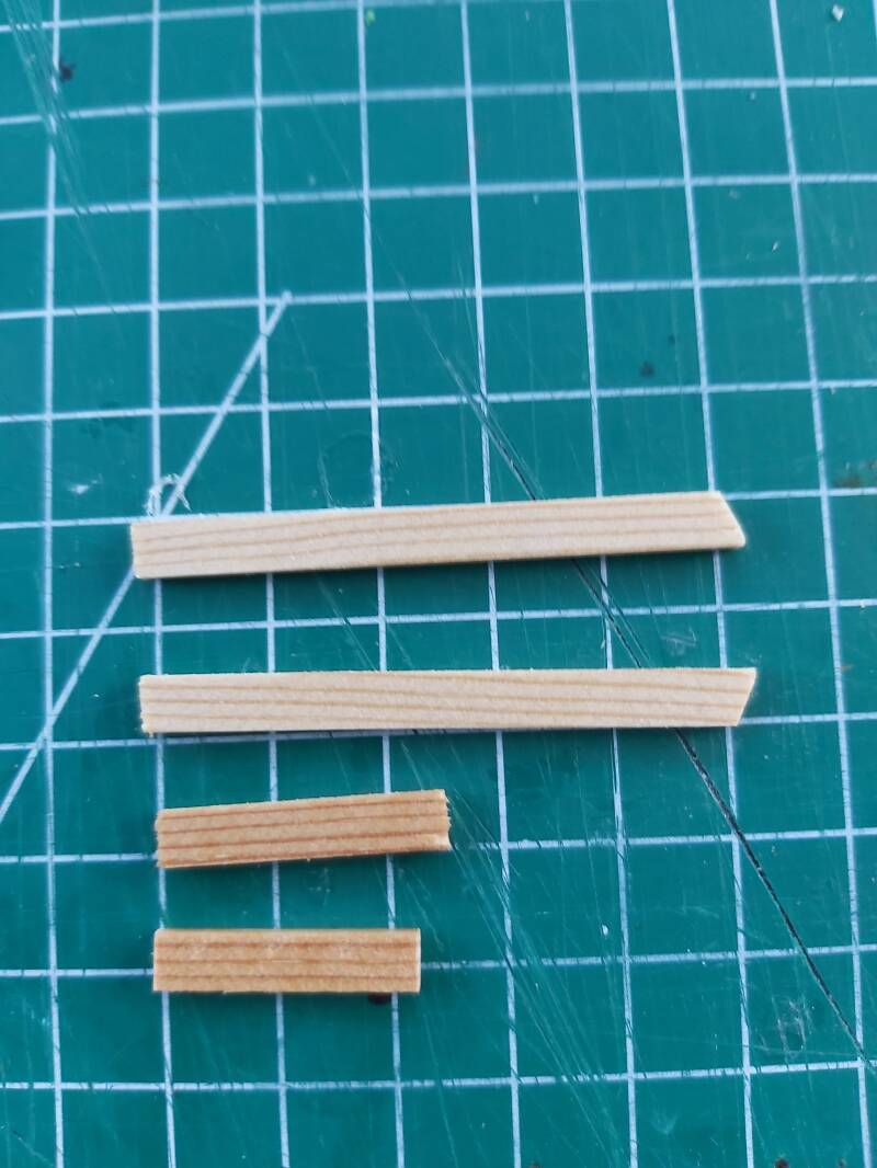 Foto 2; Zaag van het latje nr 2 2x 5,8cm af en aan één kant iets schuin afvijlen of schuren. En zaag 1x 2,2cm en 1x 2,5cm af.
