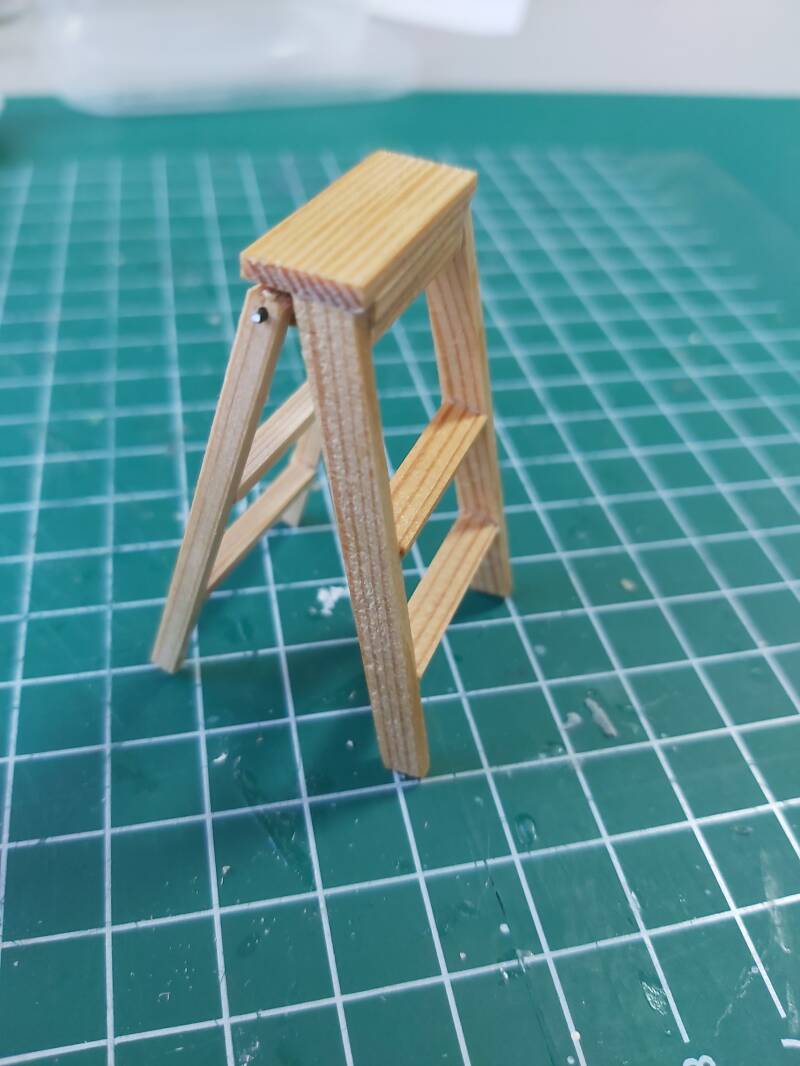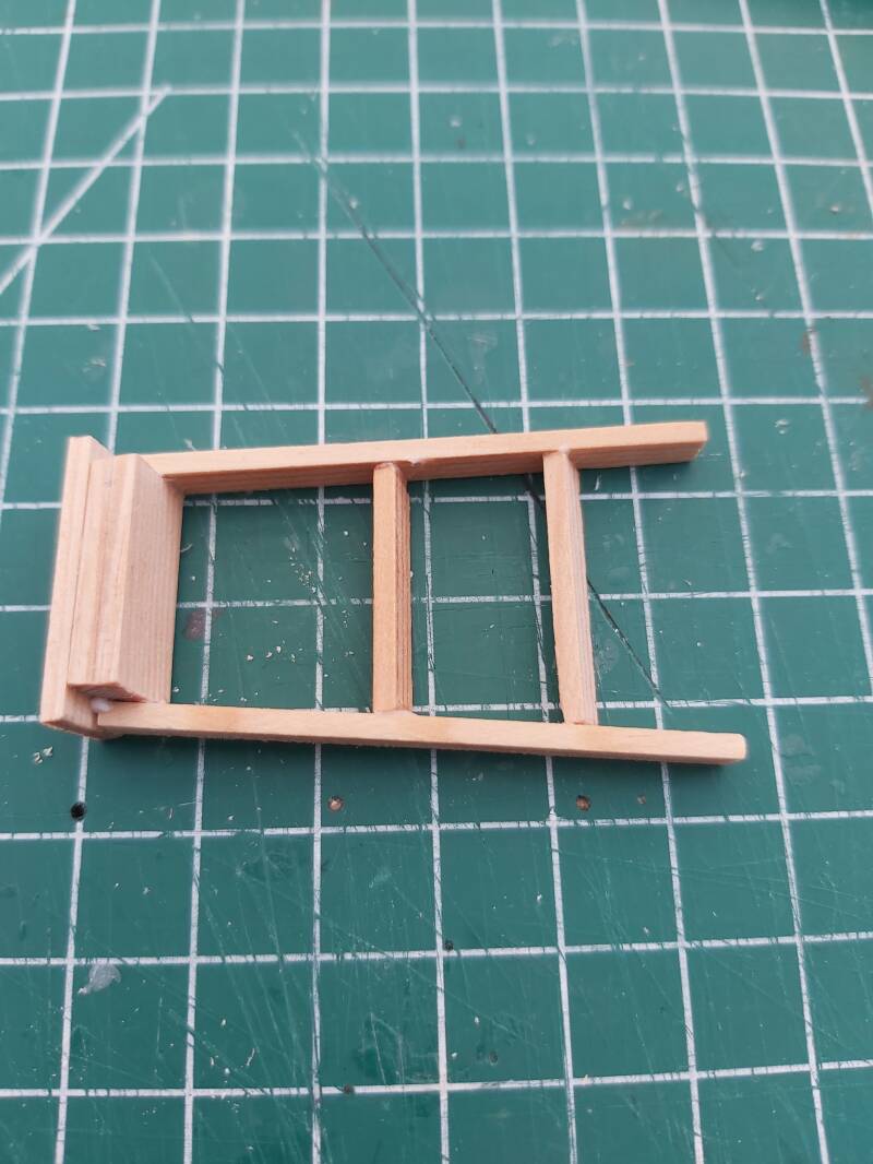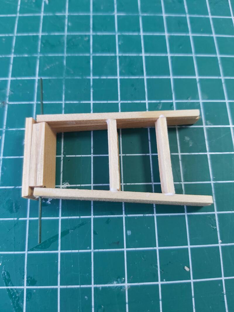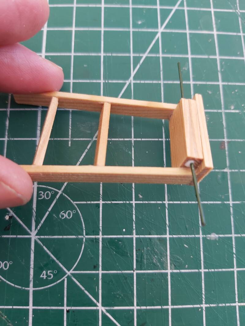 Foto 10; Schuif de pootjes over het ijzerdraadje en lijm de twee plankjes er tussen, de kortste boven. En knip het ijzerdraadje af.
