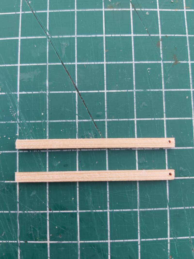 Benodigdheden: 1 Latje 2x 10mm, 2 2x 5mm, 3 3.2mm, houtlijm, boortje, ijzer draadje 1,5mm, houtlijm en schuurpapier. De latjes zijn 2mm dik.
