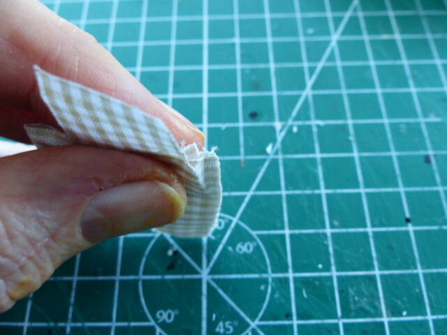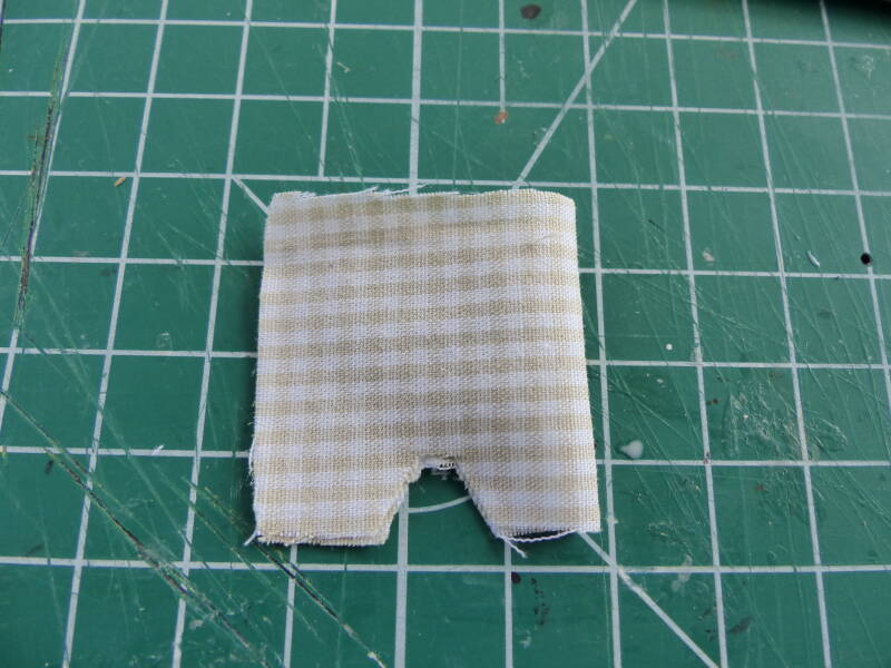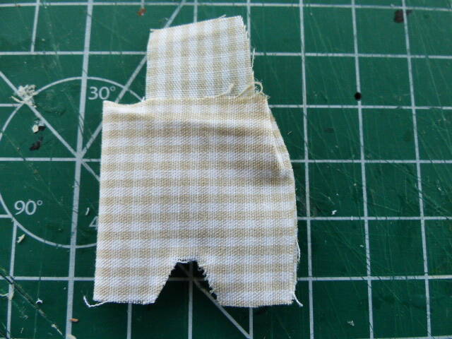 Foto 1. Vouw het lapje dubbel en knip er een driehoekje uit en lijm de zijnaad en de kruis been naad dicht. Gebruik een dun streepje lijm. Als je een klein flesje hebt speciaal daarvoor gaat het makkelijker.