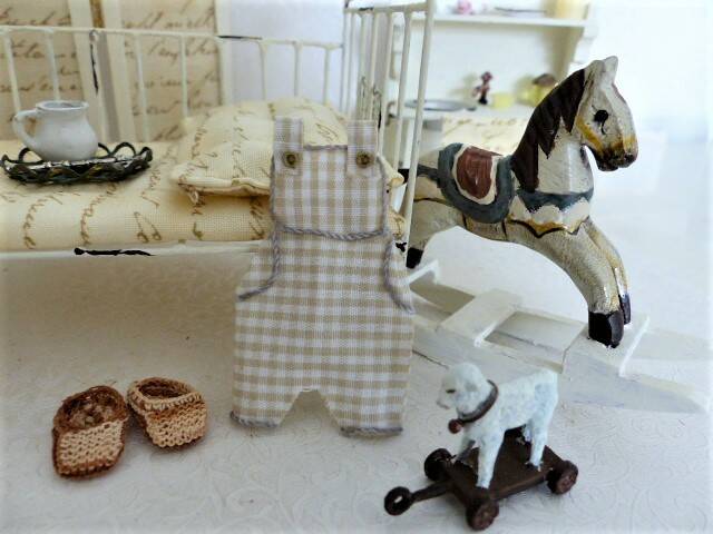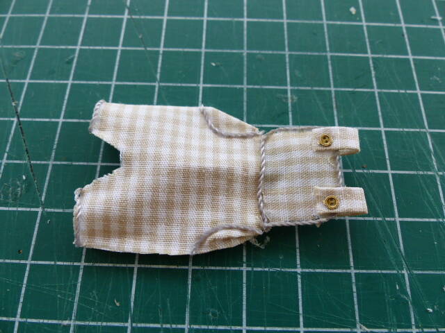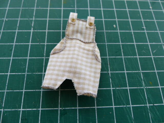 Lijm ze aan het broekje. Als laatste komen er twee knoopjes op. Ik heb nog twee nep zakjes gemaakt en de pijpjes voorzien van garen.