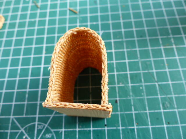 Foto 7. Weef tot 8,5cm hoog en buig het rond. Knip er een paar cm af en steek het door de gaatjes.