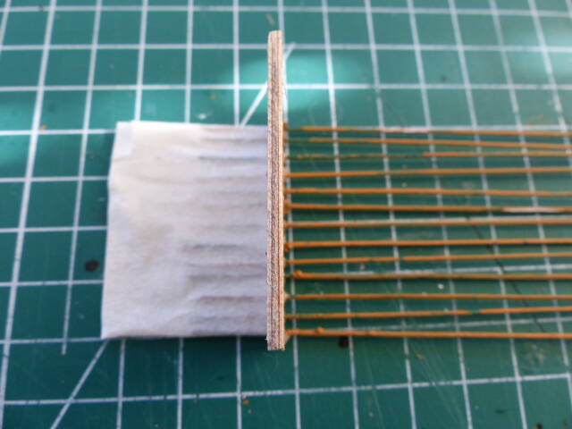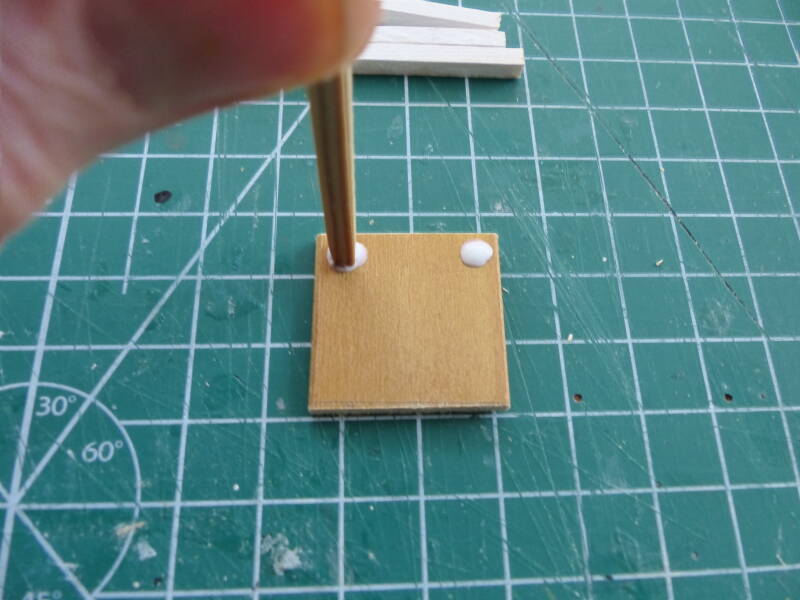Foto 4. Doop het draad eerst in de lijm en dan in het gaatje. Laat 2cm uitsteken.