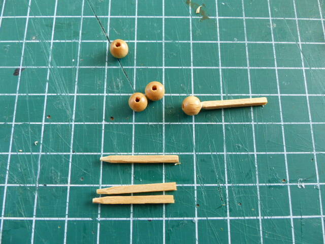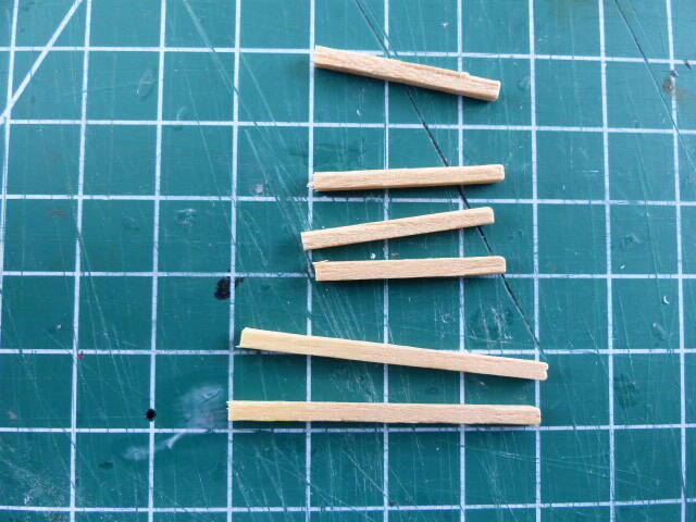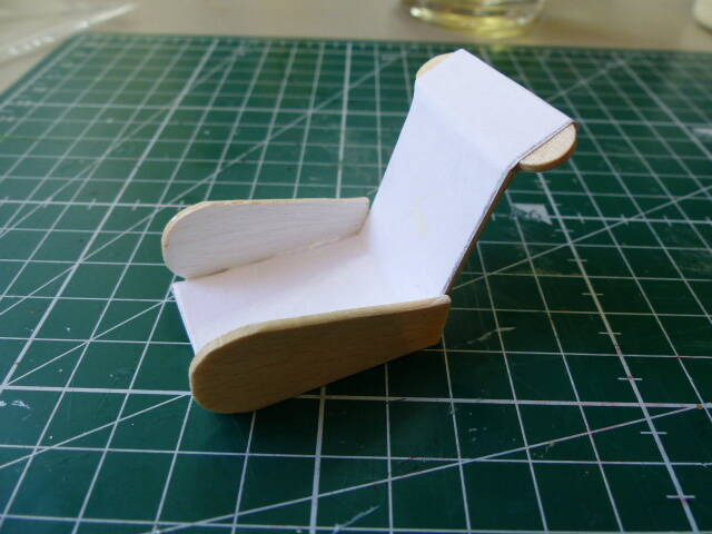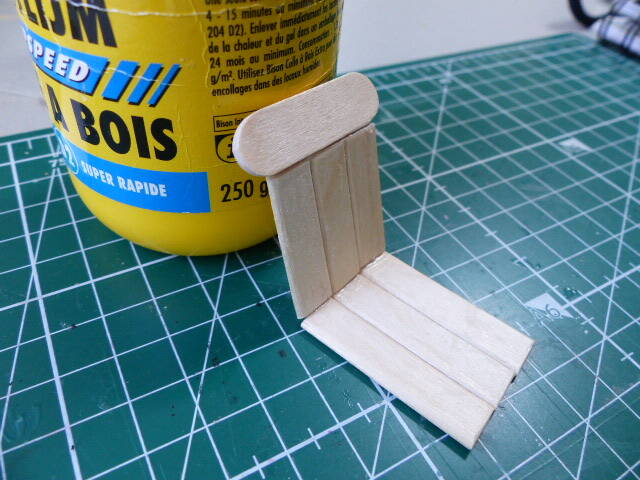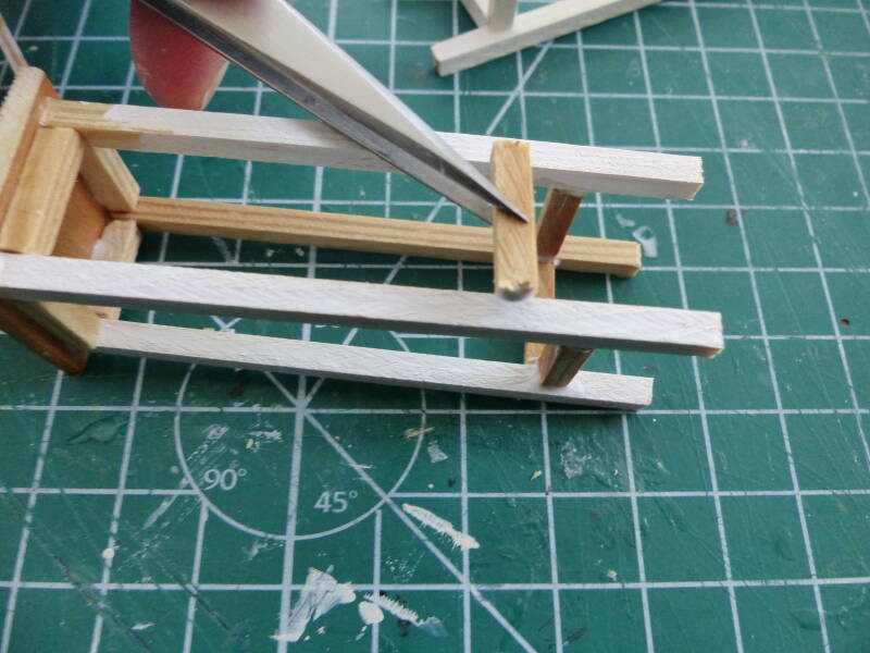 Foto 3 ; Knip 4x 2.5cm (poten) en lollystokjes af en 2x 4cm (armleuningen) af van de lucifers.