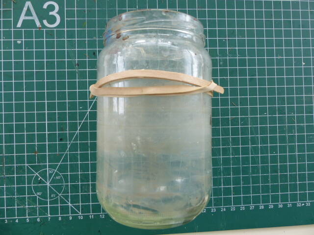 Foto 1 ; Buig 2 roerstokjes naast elkaar van 9cm om nat om een fles heen.