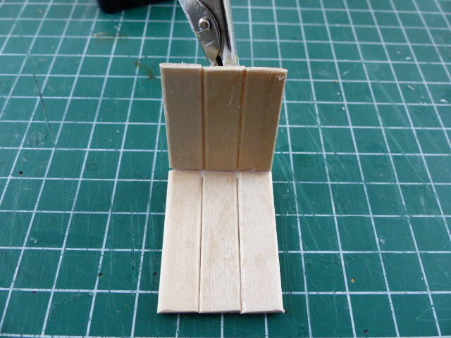 Benodigdheden; Latjes 3mm bij 3mm, houten plankje 2.5mm dikte, houtlijm en verf.