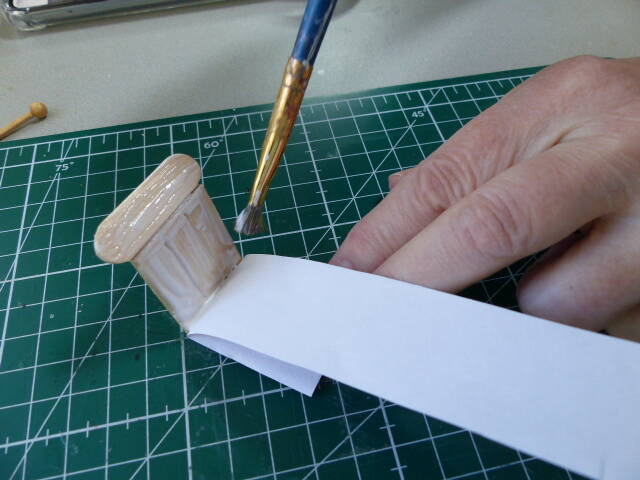 Foto 8 ; Smeer de zitting in met modpodge en lijm de papieren strook erop.